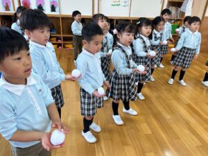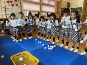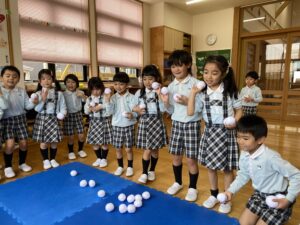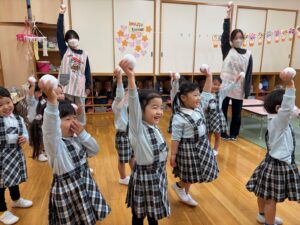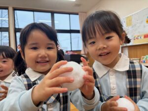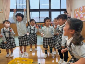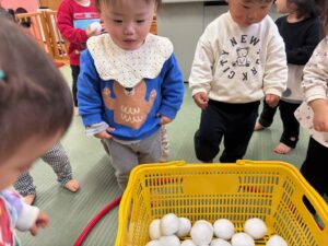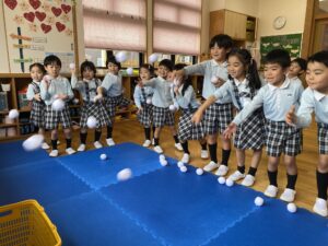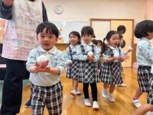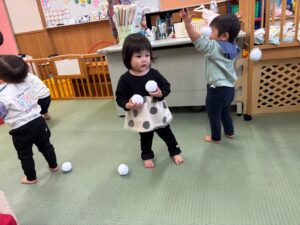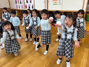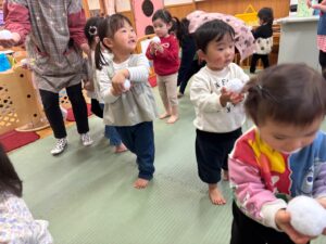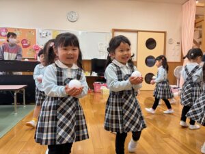 曲が終わるまでにカゴに雪玉を集めよう!みんな夢中で楽しみました♪