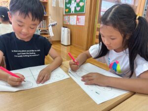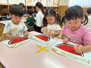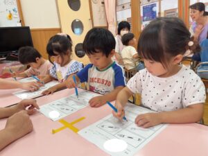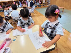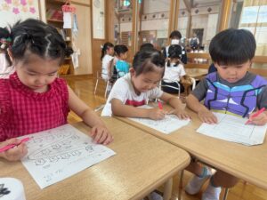 もも組さんはお絵描きや色、数、ひらがな、図形など、たくさん学んでいます!