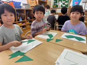 こすも組はお絵描きを覚えて描いたり、おはしでつかんだり、△5枚でパズルをしました!