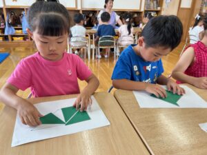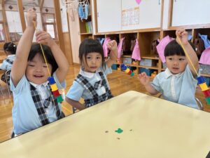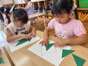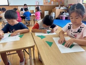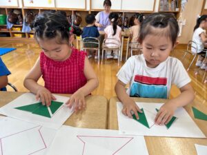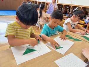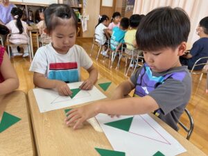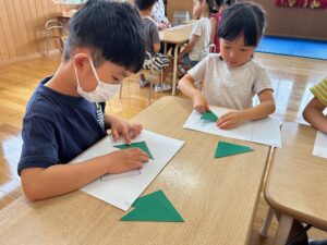 こすも組はお絵描きを覚えて描いたり、おはしでつかんだり、△5枚でパズルをしました!