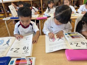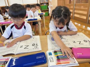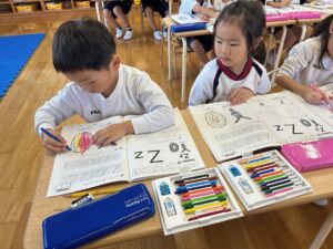 大文字、小文字をなぞって書いたり色塗りも楽しんでいます(*^O^*)☆